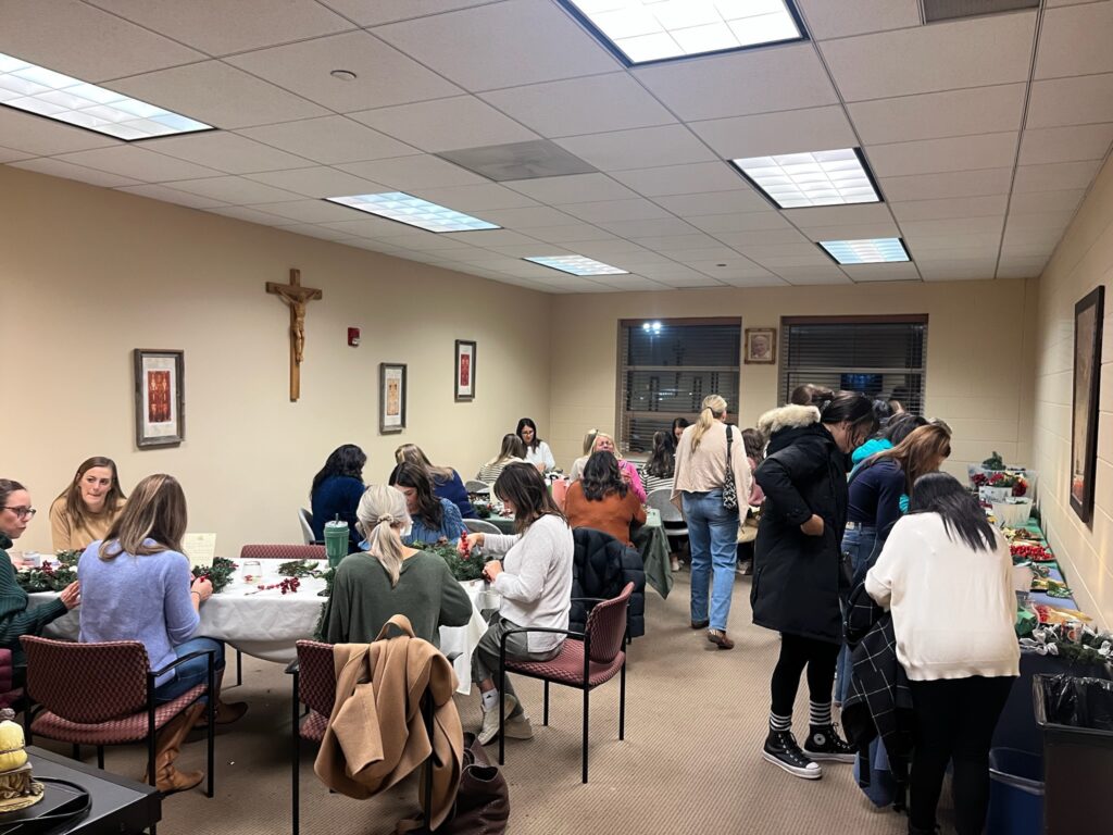 November 25: We had 52 moms attend for this month’s evening gathering! It was a marvelous mash-up of crafting and festivity to kick-off the beautiful anticipation of the Advent Season! We had a “main crafting room,” a “stationary room” for writing a prayer card, and a little refreshments and fare room too. There was a display table with more info about how to light the candles, as well as other faith-based Christmas books and activities to browse, including “The Giving Manger,” and “Mary on the Mantel.