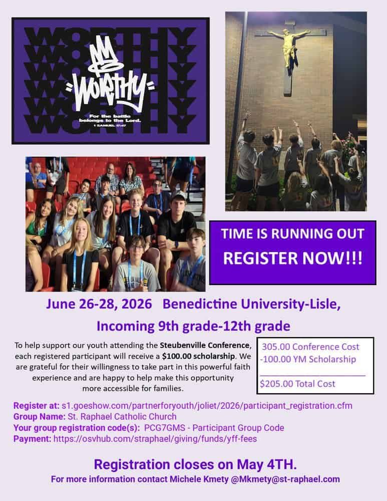 We are excited to invite the teens of our parish and their friends to join us for an incredible weekend at the Steubenville Youth Conference hosted at Benedictine University. This powerful event is designed to ignite faith, build community, and offer a meaningful encounter with Christ through dynamic speakers, engaging worship, and the Sacraments.