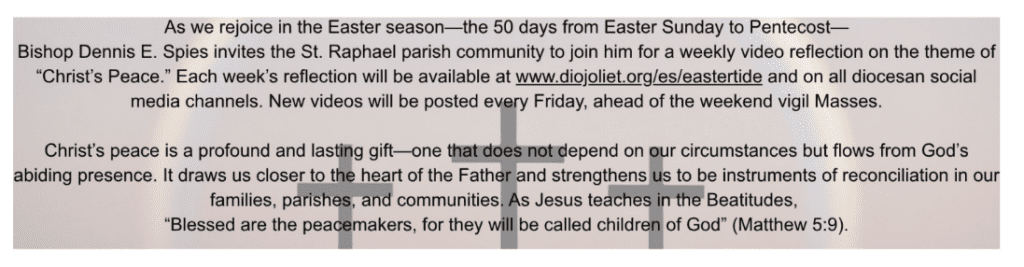 Bishop Dennis E. Spies invites the St. Raphael Parish Community to join him for a weekly video reflection on the theme of “Christ’s Peace”. Each week’s reflection will be available using the link below.