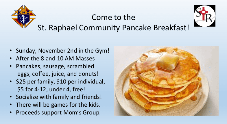 Sunday, November 2nd, the Knights of Columbus will host the Community Pancake Breakfast in the gym after the 8:00am and 10:00am Masses. The breakfast will have pancakes, sausages, scrambled eggs, donut holes, coffee and juices. The cost is $25 for a family, $10 for an adult, $15 for senior couple, $5 for ages 4-11, and no charge for a child under 4. There will be games for the kids. Please join us for food, music and friendship.
